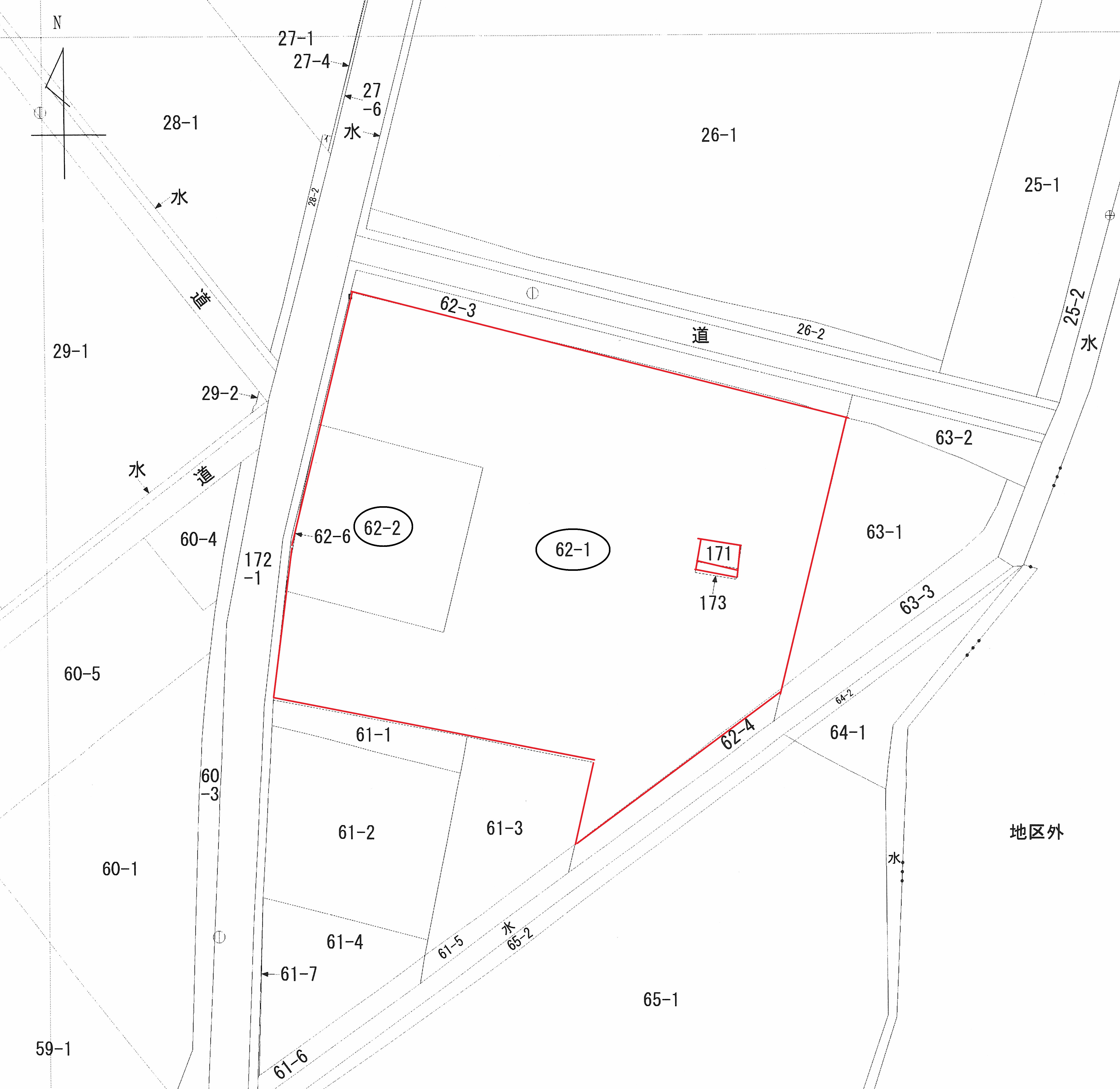 | 備考 | ◆62-1地内に、私有地有(171番:原野 11㎡・173番:原野 5.43㎡)計:16.43㎡(約4.97坪) |